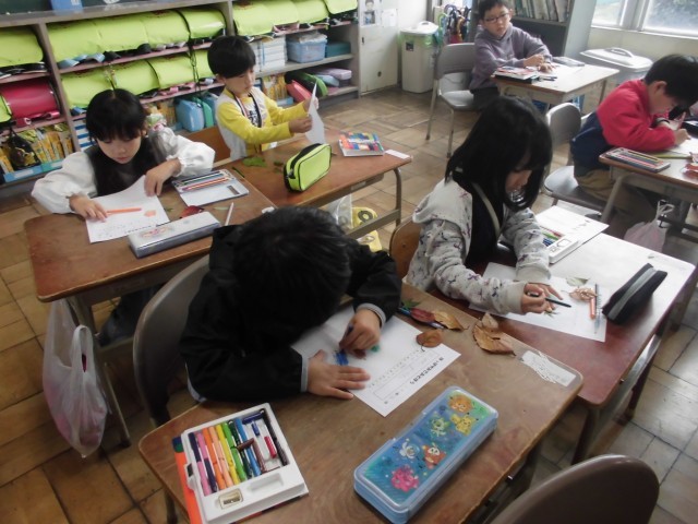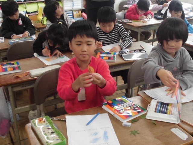 生活科の時間に、葉っぱのこすり出しをしました。運動場で拾ったきれいな色の落ち葉の上に紙を置き、色鉛筆を使って色を塗ると、紙に葉っぱの模様が写りました。きれいに模様を写し取るのは、なかなか難しかったのですが、みんな楽しそうに次々とこすり出しを行っていました。