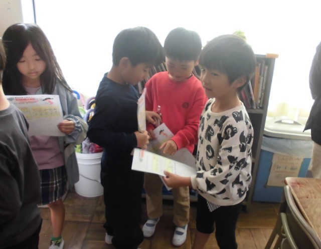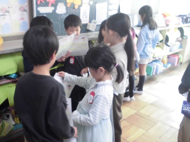 算数の時間に、たし算のお手紙作りをしました。たし算の式を計算し、答えに当てはまるひらがなを探して、暗号を解きます。お手紙を作るときには、自分で答えになるような式を考えなければいけません。みんな一生懸命取り組み、お手紙ができた後には、友達と見せ合いっこをしました。