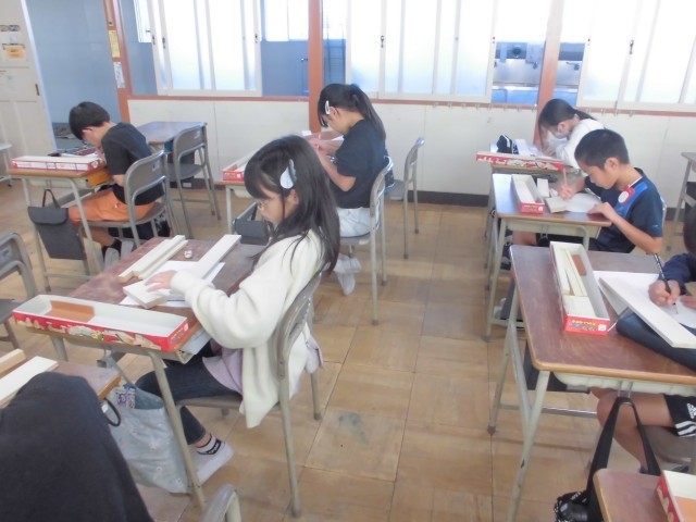 図画工作の授業では、「ギコギコのこぎり」の単元に入りました。今日は、設計図を描いて、木材を切る場所に印をつけました。次回は初めてののこぎりに挑戦します。