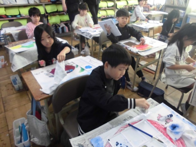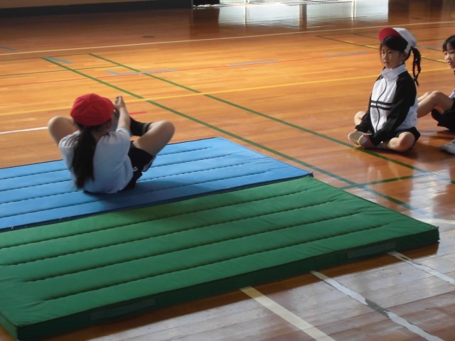 算数の時間は、色板を使って形づくりをしました。昨日は、何枚使ってあるかすぐにわかりましたが、今日は、シルエットになっていて、何枚使うのかわかりにくい問題でした。シルエットの部分に、線を引いて、使う枚数を考えて形を作りました。体育の時間は、後ろに手をつかないで、起き上がれるように、前回りの練習をしました。何度か練習したので、上手にできる子が増えてきました。その後、だるま周りにも挑戦しました。図工の時間には、お話の絵の背景を塗りました。タンポを使って、絵の具をスタンプのようにポンポンとつけていきました。