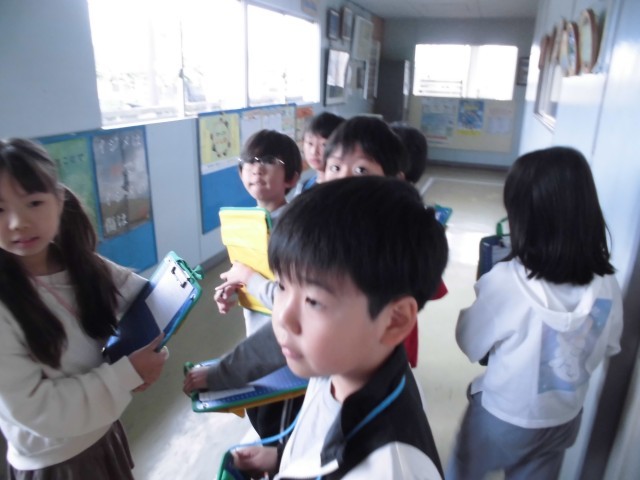 今日は社会科の学習で、学校の中にある防災に関係しているものを探しました。災害への備えがたくさんあることに気付くことができました。