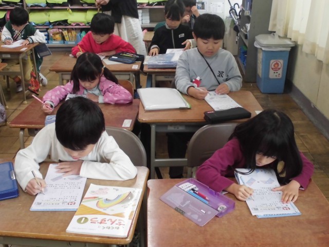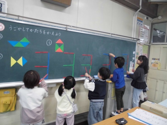 算数の時間は、形づくりの学習に取り組んでいます。今まで、色板、数え棒、点つなぎで形を作ってきました。今日は、色板と数え棒を動かして、形を変える学習をしました。どの色板を動かすか、どの数え棒を取り去るかなど、新しい形に変える方法を考えました。最後に、ドリルを使って復習をしました。