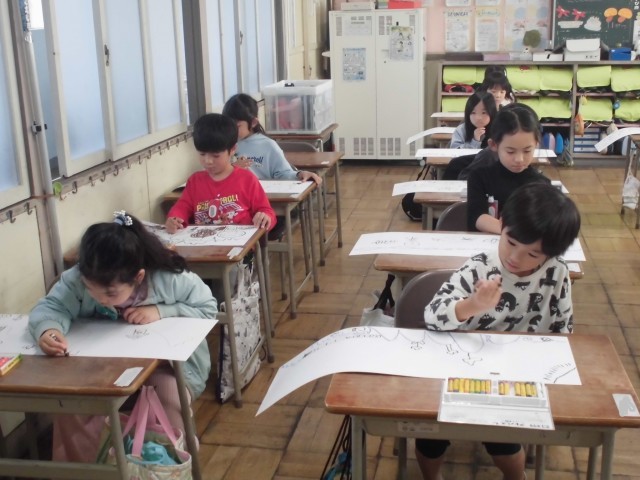 図工の時間に、「せんのぼうけん」の絵を描き始めました。かいた線をもとに冒険したい周りの様子を考えて、絵に表していきました。