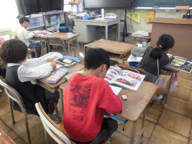 国語の時間は、「じどう車ずかんをつくろう」の学習に入りました。自分の調べたい自動車を決めて、その自動車の仕事とつくりを本を読んで考えます。今日は、どの自動車の図鑑を作るか、いろいろな本を読んで決める活動をしました。