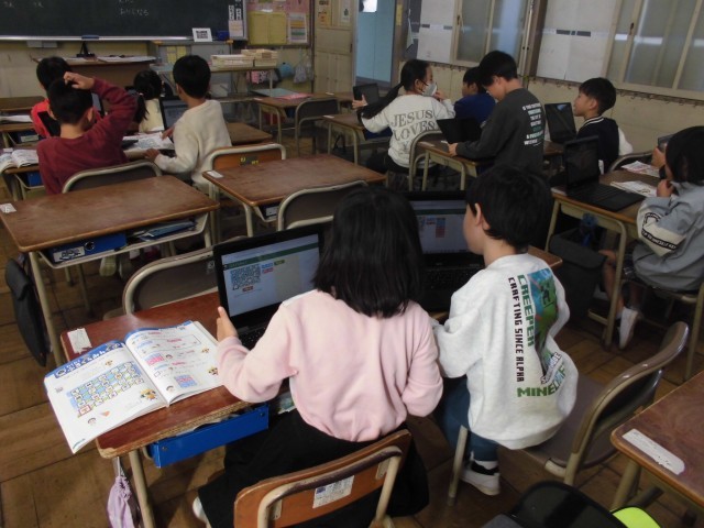 算数の教科書に載っている「ぷろぐらみんぐをしよう」の学習をしました。ロボットが欲しいと思っている道具のところまで行けるようなプログラムを作りました。隣の子と問題を出し合って、楽しく学習に取り組みました。