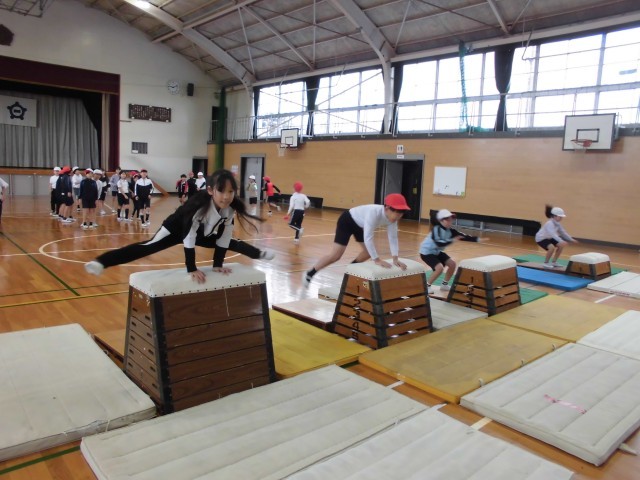 今日は体育で跳び箱を横向きにおいて開脚とびや閉脚とびに挑戦しました。自分に合う高さを見つけてきれいに跳べるように工夫をすることができました。
