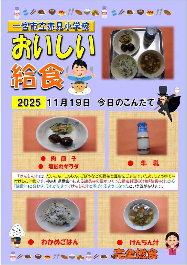 「けんちん汁」は、だいこん、にんじん、ごぼうなどの野菜と豆腐をごま油でいため、しょうゆで味付けした汁物です。神奈川県鎌倉市にある建長寺の僧が作った精進料理の汁物「建長寺汁」から「建長汁」と変わり、それがなまってけんちん汁と呼ばれるようになったという説があります。