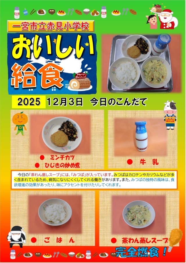 今日の「茶わん蒸しスープ」には、「みつば」が入っています。みつばはカロテンやカリウムなどが多く含まれているため、病気になりにくくしてくれる働きがあります。また、みつばの独特の風味は、食欲増進の効果があったり、味にアクセントを付けたりしてくれます。