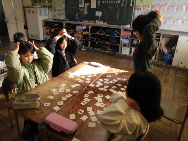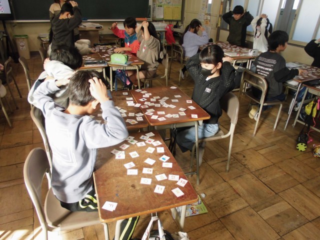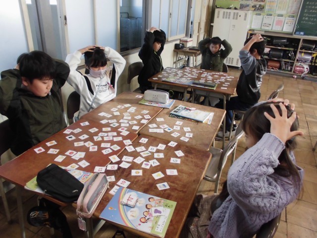 今日は英語の授業がありました。これまでに学習した英語単語のカードを使って、かるたをしました。ALTの先生が読む英単語をよく聞いて、その単語の書いてあるイラストの絵を取ることができました。楽しみながら英語に親しむことができました。