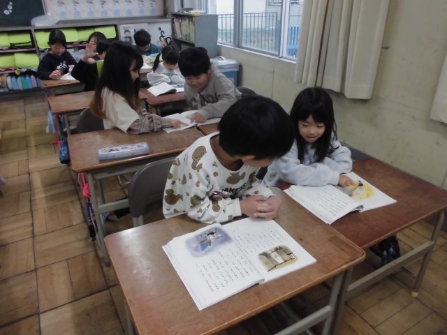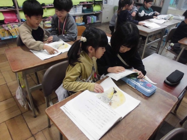 国語「たぬきの糸車」のお話の中で、自分が好きなところとそのわけをペアで伝え合う活動をしました。ペアをかえて何度か行ったので、上手に話せるようになりました。