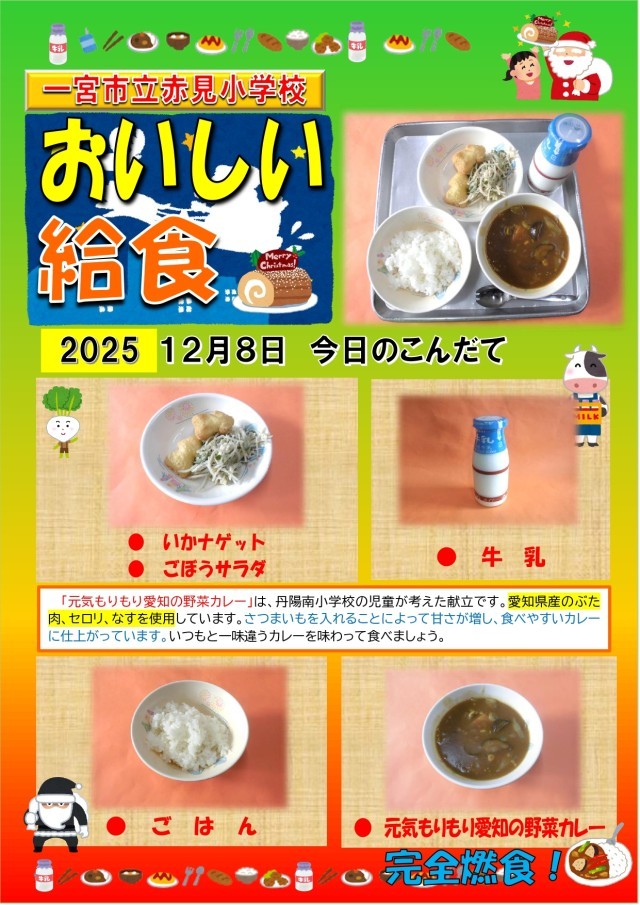 「元気もりもり愛知の野菜カレー」は、丹陽南小学校の児童が考えた献立です。愛知県産のぶた肉、セロリ、なすを使用しています。さつまいもを入れることによって甘さが増し、食べやすいカレーに仕上がっています。いつもと一味違うカレーを味わって食べましょう。
