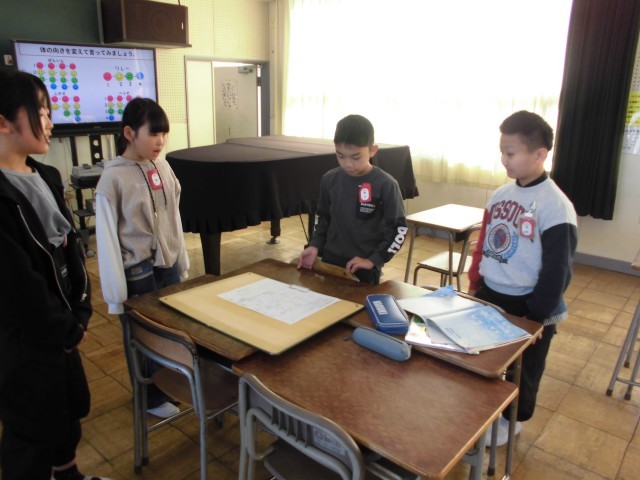 音楽では、声の表現を工夫して、「しん」という言葉を使って「ゆき」の情景を表現をしました。グループで声の重ね方や強弱、発表するときの立ち位置を工夫して、自分たちが思い浮かべる雪の様子を表現することができました。
