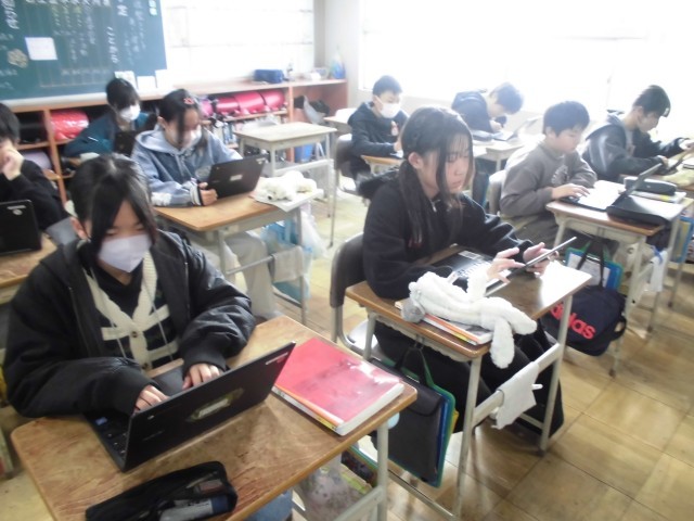 国語の学習で、自分のおすすめの曲やゲームなどを紹介するパンフレットを、ノートパソコンを使って制作しています。「リラックスしたいあなたへ」「一歩踏み出す勇気が欲しいあなたへ」など、相手を想定して、より伝わりやすいパンフレットになるように工夫しました。また、グループで文字の大きさや配置などに統一感がでるように話し合いました。