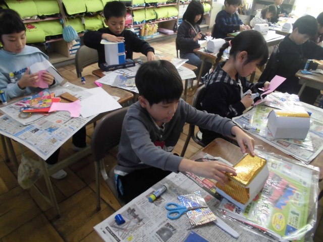 赤見っ子作品展にむけて宝箱を作り始めました。すてきな宝箱になるように折り紙で一生懸命飾り付けました。続きは、3学期に作って、パワーアップした宝箱にする予定です。