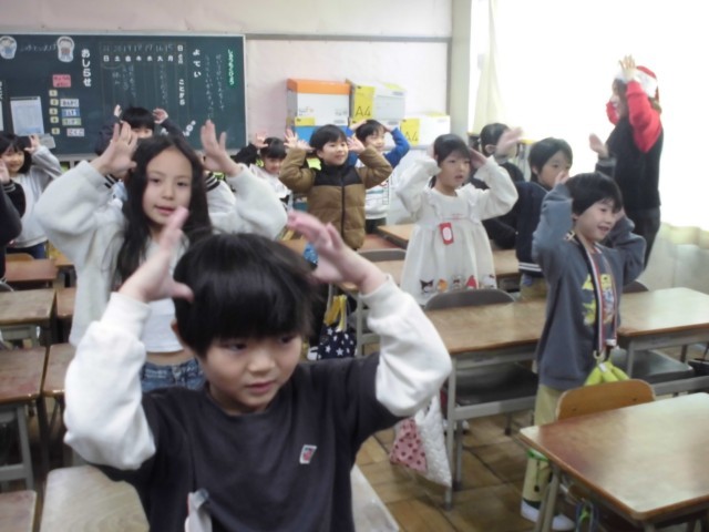 英語活動がありました。久しぶりだったので、みんなノリノリで英語の歌を歌ったり、歌に合わせて体を動かしたりしました。クリスマスに関係する言葉をいろいろ教えてもらった後、クリスマスビンゴを行いました。