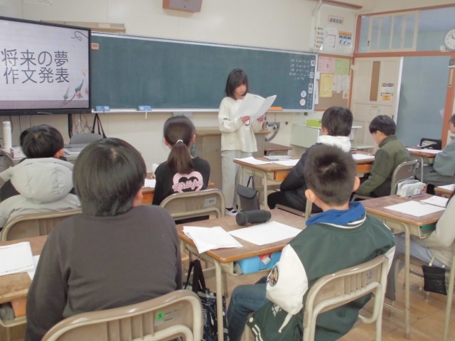 本日も多くの保護者の方にご参観いただき、ありがとうございました。授業公開では、今までの自分を振り返り、これからの自分を考える活動として「10年間メモリーズ」の発表と、将来の夢についての作文発表を行いました。子供たちはとても緊張している様子でしたが、みんな頑張って上手に作文を読んだり、発表したりすることができました。お互いの将来の夢を聞き合って、自分たちの将来の姿を思い描いている様子も見られました。