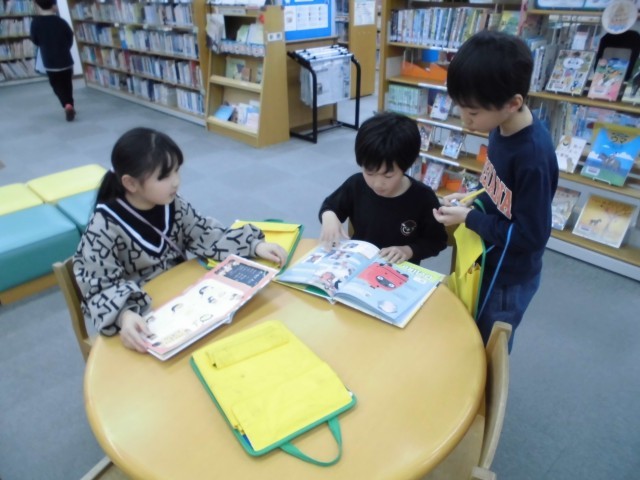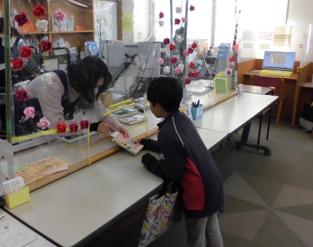 今日は、みんなが待ちに待った図書館見学の日でした。行先は子ども文化広場。iバスに初めて乗る子も多く、「お金はどこに入れるの?」「行きに払ったから、帰りは払わなくていいの?」と、知らないことがたくさんのミニバス旅。先生からお金を手渡されて自分で料金箱に入れて、お礼を言って降車する、大人にとっては当たり前の行動も、初めての子どもたちには、とても新鮮な体験だったと思います。公共交通機関の使い方を学ぶとてもよい機会になりました。行きのバスは戸惑っていた子も、帰りのバスではとても上手に降車できました(^^♪図書館では、説明を聞いた後で、読み聞かせやクイズをしてもらい、図書館の使い方を改めて学んだり、実際の施設見学へのワクワク感を高めてもらったりしました。中高生が勉強できる部屋や、普段は入れない閉架書庫などを見せてもらってから、最後に自分で1冊本を借りました。動画で見たOPACという検索機械を触ったり、自動貸し出し機で貸し出し手続きを自分でしてみたり、実際にカウンターで話をしながら本を借りたりと、学校の図書館の中だけではできない経験がたくさんできました。行きも帰りもにっこにこで、元気に過ごせた2-1の図書館見学でした。