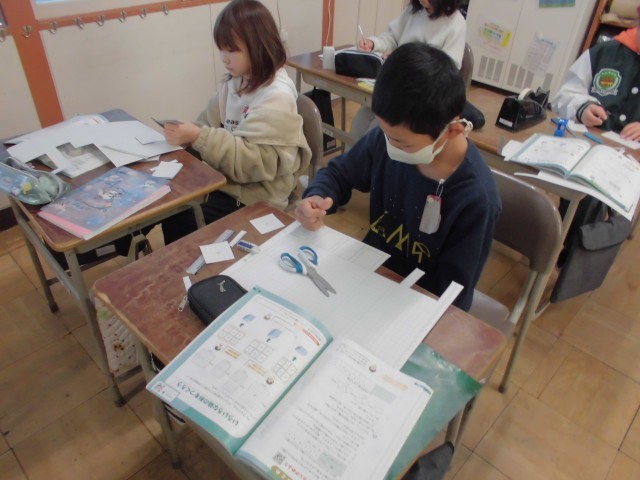 算数の授業では、「直方体と立方体」の単元に入りました。今日は工作用紙で直方体と立方体を作り、それぞれの面の数、辺の数、頂点の数を調べました。