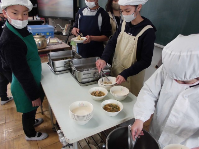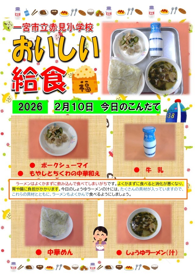 【献立あれこれ】『しょうゆラーメン(汁)』『ポークシューマイ』『もやしとちくわの中華和え』ラーメンはよくかまずに飲み込んで食べてしまいがちです。よくかまずに食べると消化が悪くなり、胃や腸に負担がかかります。今日のしょうゆラーメンの汁には、たくさんの具材が入っていますので、これらの具材とともに、ラーメンもよくかんで食べるようにしましょう。