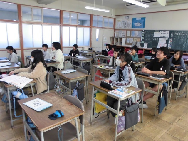 写真は、外国語の授業の様子です。どこの国に行きたいかやその国に行きたい理由などを、英語を使って表現する練習をしました。