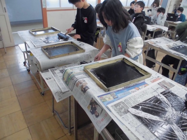 図工の授業では、版画の仕上げをしました。初めて彫刻刀を使って彫った版を、刷り紙に刷りました。素敵な作品に仕上がりました。