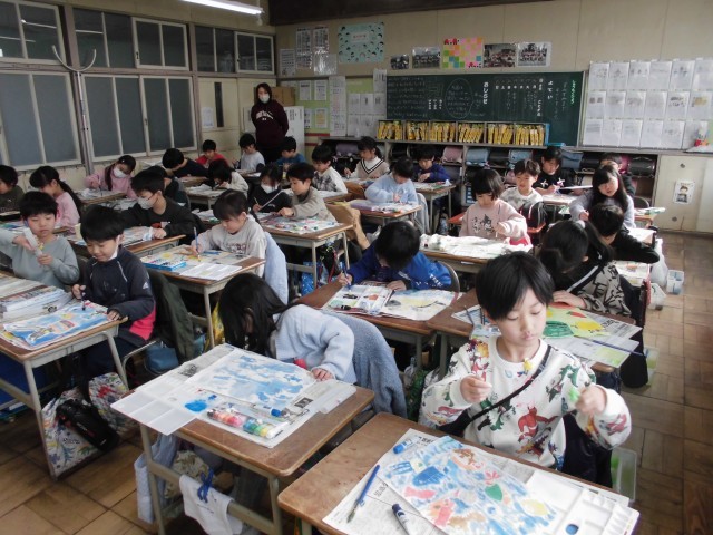 今日の図工では、刷った版画の背景を、絵の具で塗りました。今回の版画は、「シールで版画ができることにまずびっくり!」「次に、紙を水に浸して刷ることにびっくり!」そして今日、背景を絵の具で塗るときには「紙の裏から塗ることに3度びっくり!」の、2年生のみんなにとっては、仕上げるまでどんな手を使うのかわからないところがおもしろい作品作りとなりました。意表を突くのも突かれるのも、楽しいもので、どんな仕上がりになるのかワクワクしながら作品を仕上げていました。来週台紙を貼って、完成です(^^♪