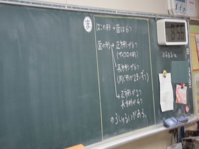 算数で、箱を使って面の数や面の形を考える学習をしました。目の前に具体的なものがあると、イメージしやすく学習作業がはかどる子が多いようです。