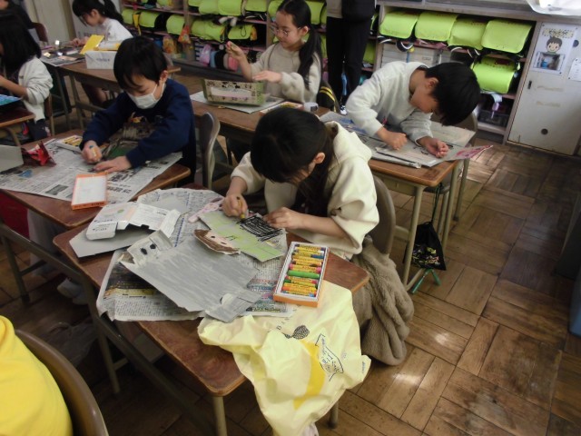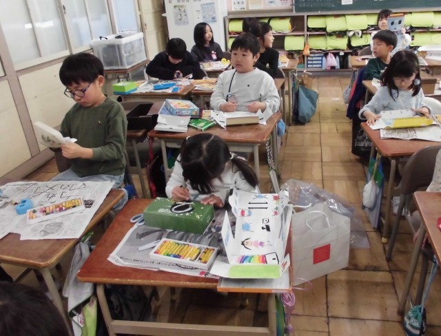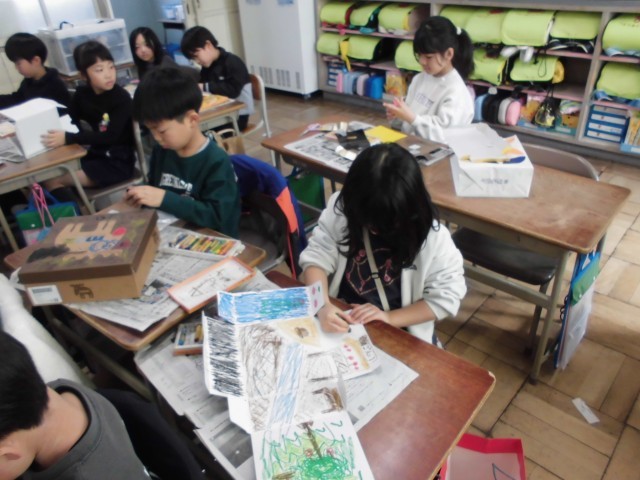図工で「いろいろなかたちのかみに」の学習をしました。家から持ってきた空き箱を開いて、その形や色を生かして絵を描きました。「ロボットに見える」「町の様子を描いたよ」などと友達と話しながら、楽しそうに作品を作っていました。