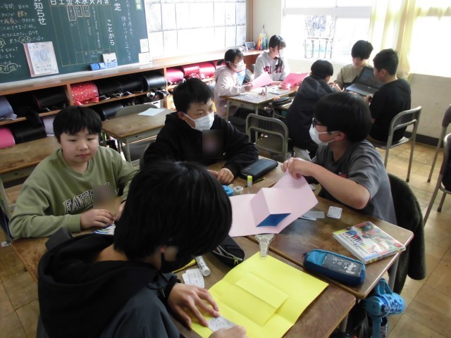 これまでお世話になった先生たちのために、メッセージカードを作りました。感謝の気持ちを込めて手紙を書いたり、先生の好きなものを絵に書いたりしていました。