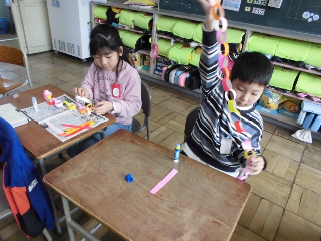 新しい1年生の教室を飾るための輪飾りを作りました。今年は1組用と2組用になるように、赤系と青系の2種類の輪飾りを作りました。みんな一生懸命つくったので、たくさんの輪飾りができました。