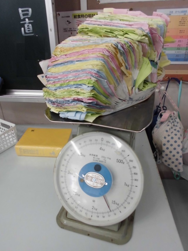 本校では、令和4年度から「辞書引き学習」を導入して、子供たちの語彙力や言葉の力を高めるための教育を進めてきました。まもなく卒業を迎える6年生に、辞書引き学習で使用してきた国語辞典を見せてもらいました。元の国語辞典の厚さをゆうに超え、本体から外れそうになっているページもあります。この4年間の学習の成果を物語っているような堂々とした雰囲気すら漂っています。重さをはかるとなんと1.7㎏ほどもありました。小学校での学習の成果はもちろん、自分自身の成長や思い出が感じられる辞書になったことだと思います。