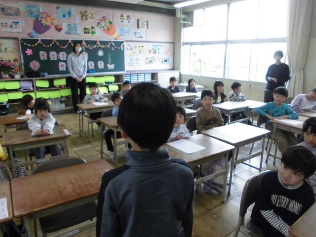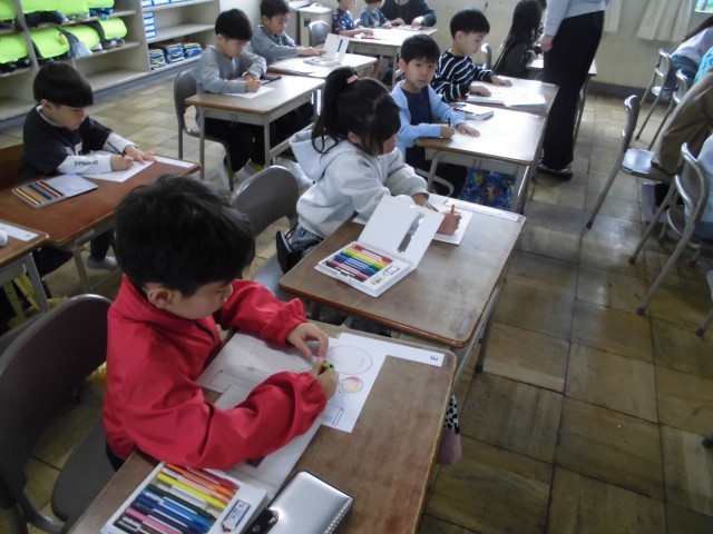 自己紹介カードを書いて、それを使って自己紹介をしました。名前と、好きな食べ物や好きな色、好きな動物を紹介しました。早くお互いの名前を覚えて、仲良くなってくれるとうれしいです。