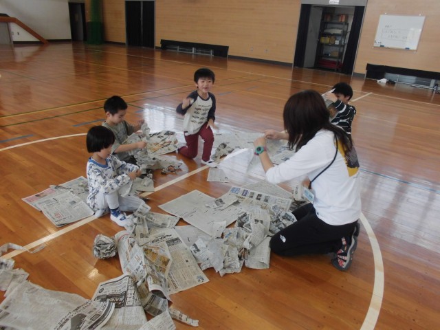今年初めての生単の授業がありました。「新聞紙と仲良くなろう」のめあてで、新聞紙を広げたまま飛ばしたり、丸めて投げたりしました。最後にたくさんの新聞紙を破って、紙吹雪のように天井に向かって投げ上げました。頭の上にひらひらと降りてくるのを見て、みんな大喜びでした。