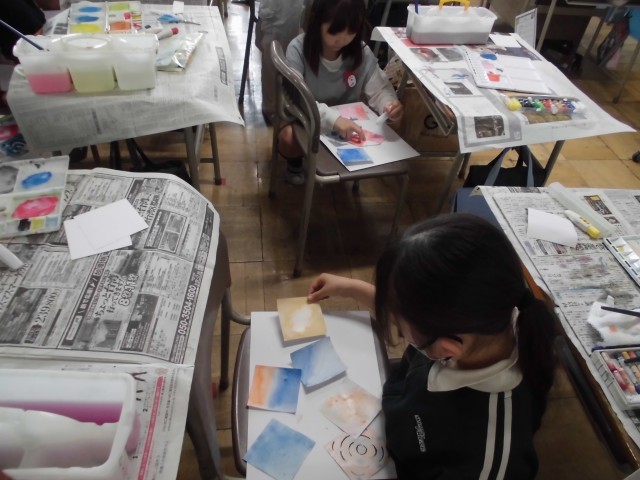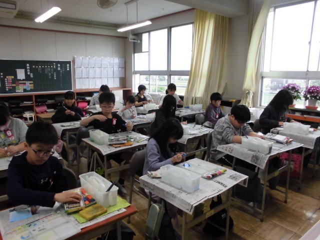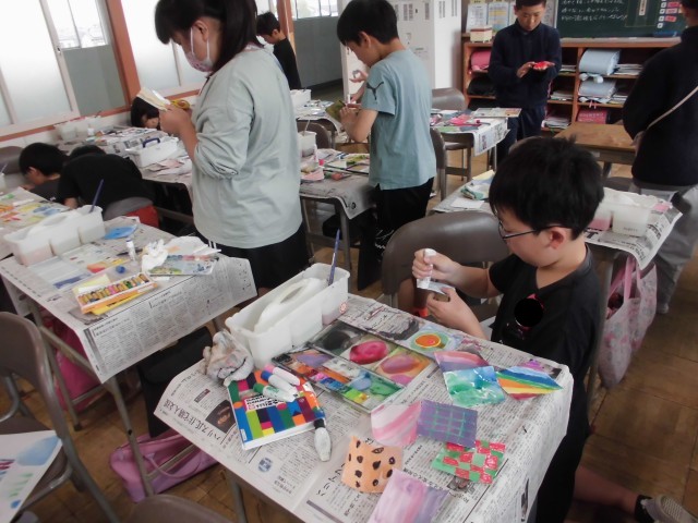 今日は5年1組では、はじめての図工がありました。筆の使い方やパレットの使い方の再確認をし、「心のもよう」という単元の学習をしました。自分の気持ちや心に合う形や色を考え表現をしました。算数では、「整数と小数」という単元のまとめをしました。学習したことを生かして、応用的な問題にも挑戦することができました。