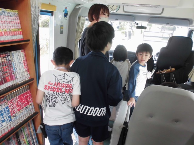 ほたる号で本を借りました。自分のお気に入りの本を目を輝かせて探していました。今回は、1年生は本を借りることはできませんでしたが、次にどんな本を借りようかといろいろな本を手に取っていました。ほたる号の車の中にも入りました。たくさんの本よりも、運転席に興味津々の子供たちでした。