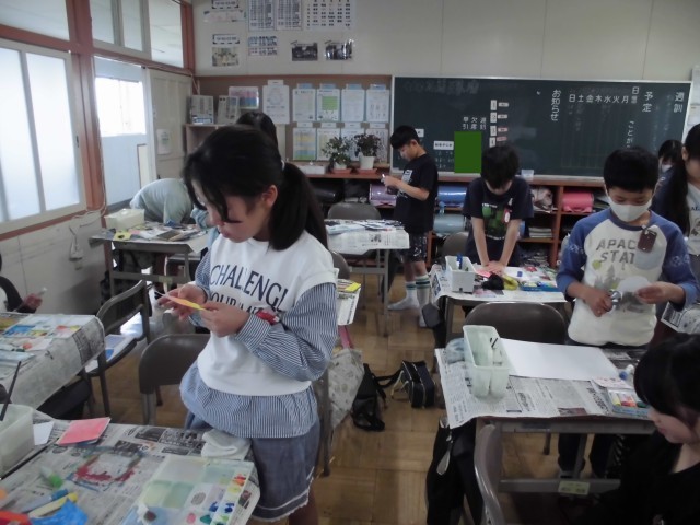 2時間目に1組は算数の授業をしていました。新しく「容積」という言葉が出てきて、計算もより難しくなる学習ですが、教師の説明をしっかり聞くことができていました。2組は、図工の授業で、絵の具で描いた「気持ちカード」を画用紙に切ったり貼ったりして作品を作りました。どのように配置するのか考えながら作品作りができていました。