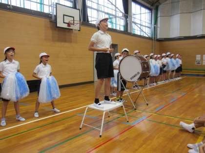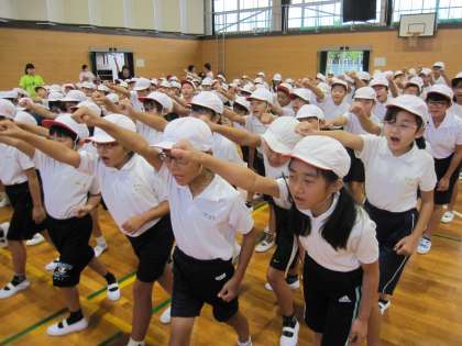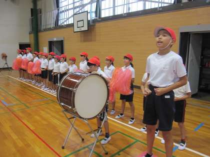 朝から雨が降り、屋内運動場での全校応援練習となりましたが、雨雲を吹き飛ばすくらいの力強い声で、紅白共に応援練習を行うことができました。