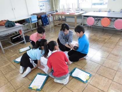 「自分が生まれたとき」の体験をしました。子宮袋から出てくる体験、妊娠シュミレーターをつけて妊婦体験、赤ちゃんのお世話体験という3つの体験を行いました。大きなおなかで生活をすることや3時間おきにミルクをあげることの大変さを感じました。大変な思いで産んでくれたことを知る機会となりました。