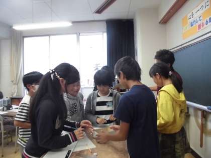 一枚の板を切って、組み合わせて作品を作ります。形や大きさを考え、一枚の板を無駄のないように使って必要な板の大きさや枚数を決めていきます。友達と相談しながら工夫をしていました。相談した後、「そうか。そうすればいいんだ!」と言って、笑顔で自分の席に戻る姿を見て、図工の作品も人と関わり合ってアイデアが湧き出ていくんだな、と思いました。