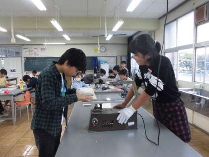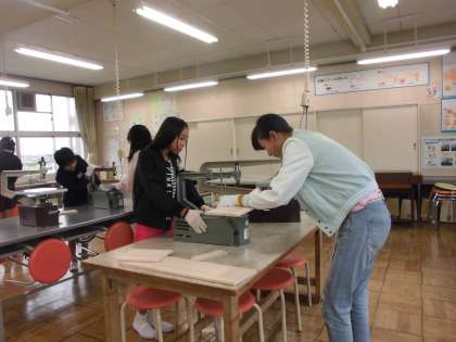 設計図をもとに厚紙で型を作って作品の全体を確かめた後、電動糸のこぎりを安全に正しく扱い、ペアで木取をしました。ガタガタという音とともに、木が切り取られていきます。真剣に、作品が出来上がっていくのを楽しみに作っています。