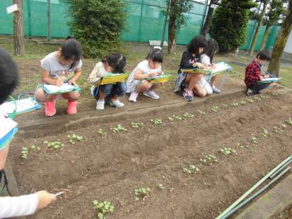 学年菜園、夏野菜の次はダイコンの種をまきました。1週間ほどで芽がだました。こんな小さな芽から、どんなダイコンができるか、楽しみですね。