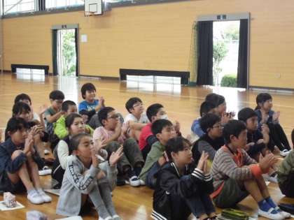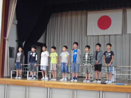 屋内運動場で初めて群読の練習をしました。初めてですが、しっかりと声を出している様子がとてもよいと思いました。聞き手も気持ちのよい拍手をし、群読を通して、5年生のみんなが、一歩成長したいと願っていることを感じました。応援しています。