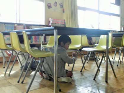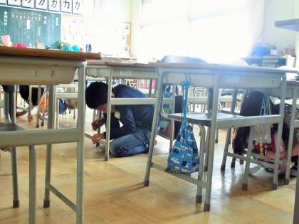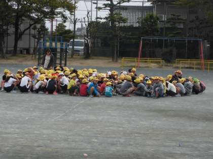 みんなが思い思いに活動する昼放課に、地震を想定したミニ避難訓練を実施しました。緊急放送を聞き取り、自分の身の安全を確保する練習でした。教室、廊下、階段、運動場など、それぞれの場所で異なる判断が必要です。日頃の先生の指導や校内のいたる所に掲示してある安全確保の姿勢図を見て動けました。