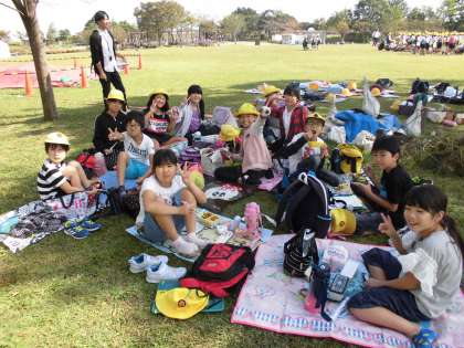 木曽三川公園の芝生の上でお弁当を食べました。おうちの人に作ってもらったお弁当をみんなで食べました。どの子もおいしそうに食べていました。