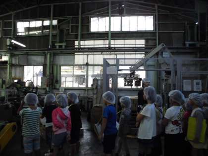 工場の中では、段ボールを閉じる機械や、現在使われているみそ桶を見せていただきました。