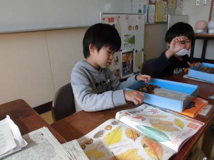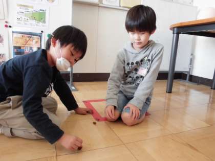 先日の校外学習で拾ってきたどんぐりを使って、こまを作りました。どんぐりに穴をあけ爪楊枝をさします。楊枝をまっすぐに刺さないと、こまが上手に回りません。こまの回し方にもコツがあるようで、回しているうちによく回るようになってきました。他のおもちゃも作っていきます。