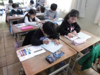 屋内運動場と理科室に探検に行きました。教室にないものがいっぱいあって、みんな目を輝かせていました。「いすの形がちがうね」「日本の旗があるね」などと、友達と話しながら、楽しそうにカードに絵を描いていました。