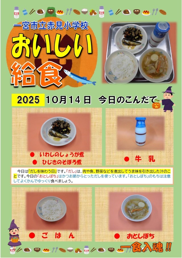 【献立あれこれ】『おとしぼち』『いわしのしょうが煮』『ひじきのそぼろ煮』今日は「だしを味わう日」です。「だし」は、肉や魚、野菜などを煮出してうま味を引き出した汁のことです。今日の「おとしぼち」はかつお...