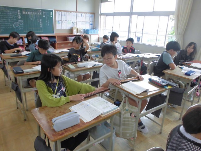 算数の授業で「そろばん」を学習しました。3年生の時よりもレベルアップして、小数の表し方や計算の仕方、一兆を超える数の表し方を練習しました。