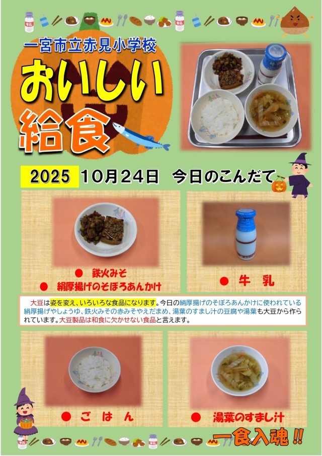 【献立あれこれ】『湯葉のすまし汁』『鉄火みそ』『絹厚揚げのそぼろあんかけ』大豆は姿を変え、いろいろな食品になります。今日の絹厚揚げのそぼろあんかけに使われている絹厚揚げやしょうゆ、鉄火みその赤みそやえ...